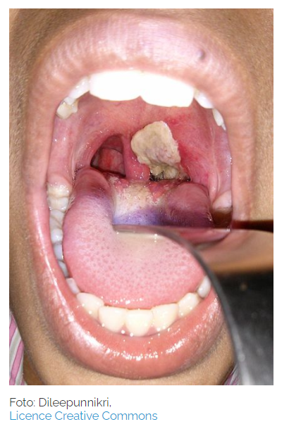 Diphtherie ist eine bakterielle Infektionskrankheit, die sowohl die oberen Atemwege als auch die Haut betreffen kann. Anfängliche Symptome sind Halsschmerzen, Husten und Anschwellen der Lymphknoten. Darüber hinaus bilden sich in Nase, Rachen und in der Luftröhre fest haftende Belege, welche zu Atemnot führen können. Eine Erstickungsgefahr ist bei einem schlimmen Verlauf der Erkrankung nicht auszuschließen. Außerdem ist ein süßlich-fauliger Mundgeruch, der durch ein weißlich-gelblichen Belag auf den Mandeln ausgelöst wird, typisch für eine Diphtherie-Erkrankung. Die Bakterien sondern außerdem Gift ab, welche weitere Organe beschädigen können, wodurch beispielsweise Pneumonien (Lungenentzündungen) oder eine Karditis (Herzentzündung) entstehen können.