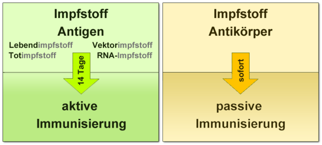 Abb. 1.: Wikipedia: Impfstoff. Der Impfstoff enthält oder erzeugt bei der aktiven Immunisierung ein Antigen, gegen welches das Immunsystem des Patienten binnen 14 Tagen eigene Antikörper bildet, was eine anhaltende Immunität bewirkt. Werden lediglich Antikörper verimpft, spricht man von passiver Immunisierung, der Schutz tritt sofort ein, hält aber nur kurzzeitig an.